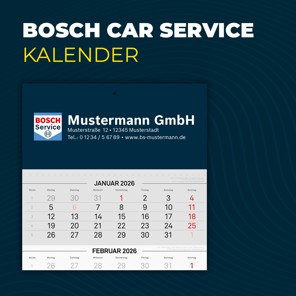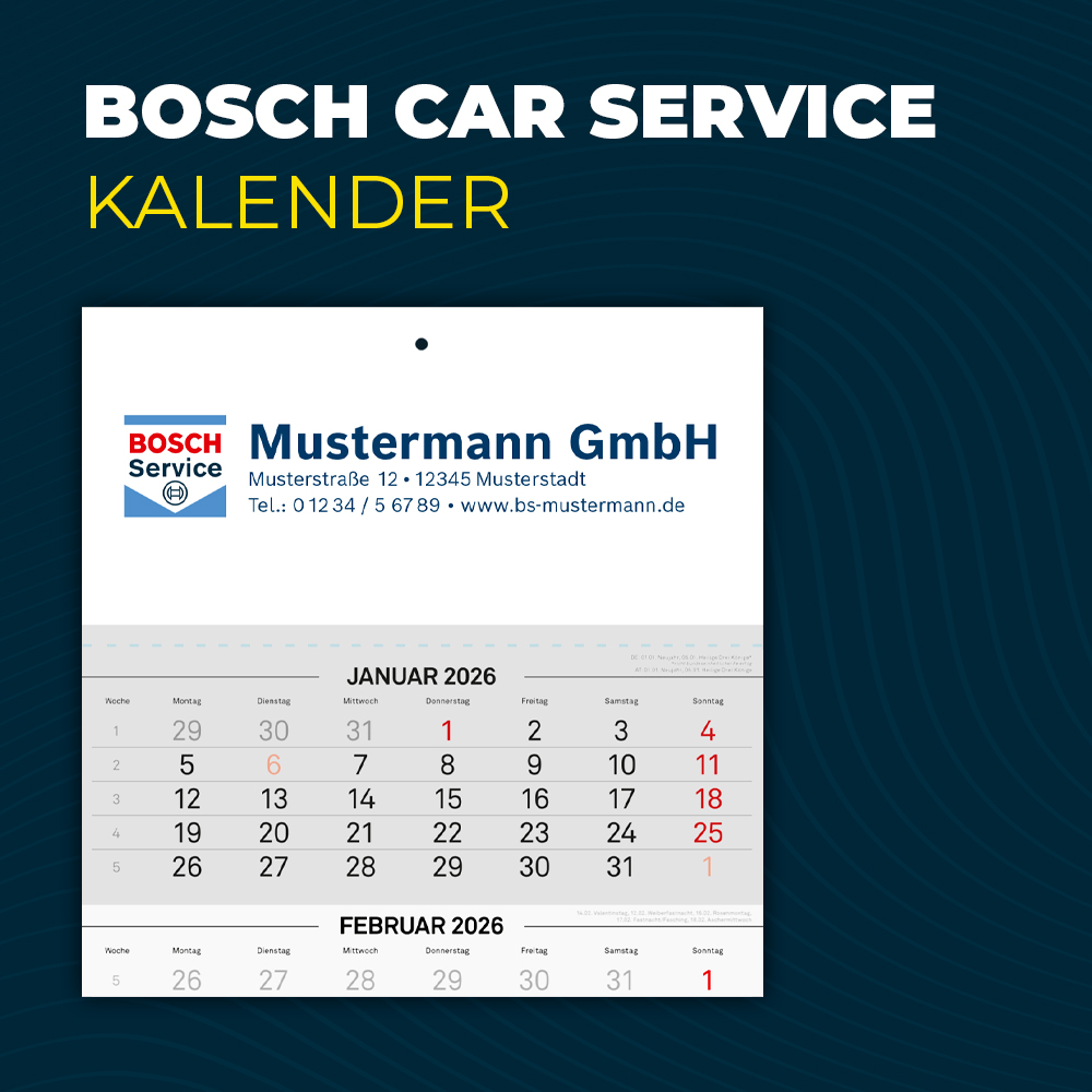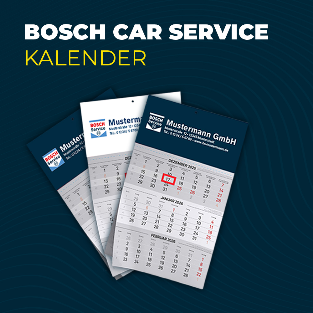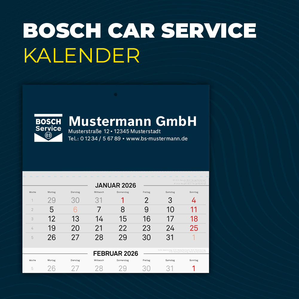 Fürs eigene Büro, Ihre Kundschaft oder Ihre Geschäftskontakte: Ein individuell gestalteter 3-Monatskalender mit Bosch Car Service Logo und Kontaktdaten. Das vorgedruckte Kalendarium mit Feiertagen sorgt für Struktur, während Ihre Werkstatt auf dem Kopfteil stets präsent bleibt.